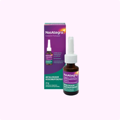 Ganz neu in der Selbstmedikation gibt es jetzt das NasAllegra® Heuschnupfenspray. Die Wirkstoffkombination aus Azelastin (Antihistaminikum) und Fluticason (Glukokortikoid) vereint die Vorteile der beiden oben genannten Wirkstoffgruppen in einem Nasenspray und wird in der Leitlinie1 wirksamer als die jeweilige Monotherapie mit Antihistaminika oder Glukokortikoiden beschrieben.