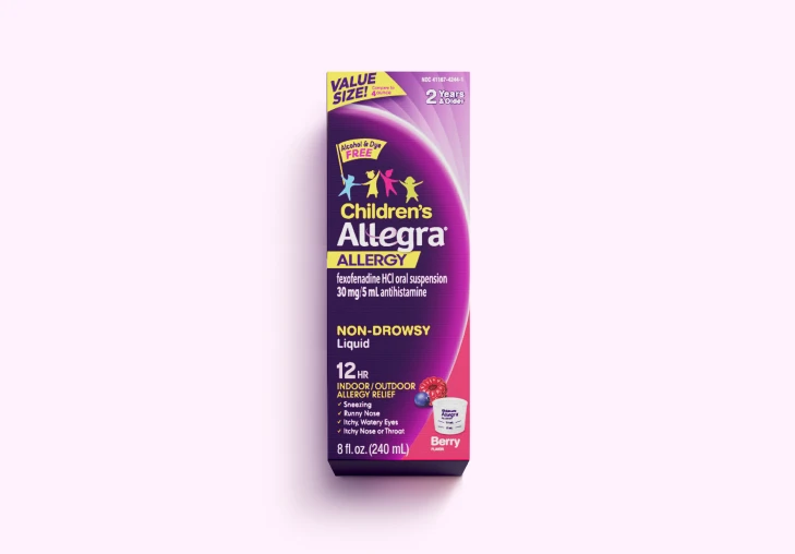 Children's Allegra® Allergy 12 Hour Liquid tackles tough allergy symptoms for kids aged 2 to under 12 years. It's non-drowsy, which means their concentration won't be impacted due to drowsiness. As the #1 allergist-recommended children's non-drowsy allergy brand*, Children's Allegra® brings effective symptom relief to runny noses, watery eyes, itchy noses, and more.